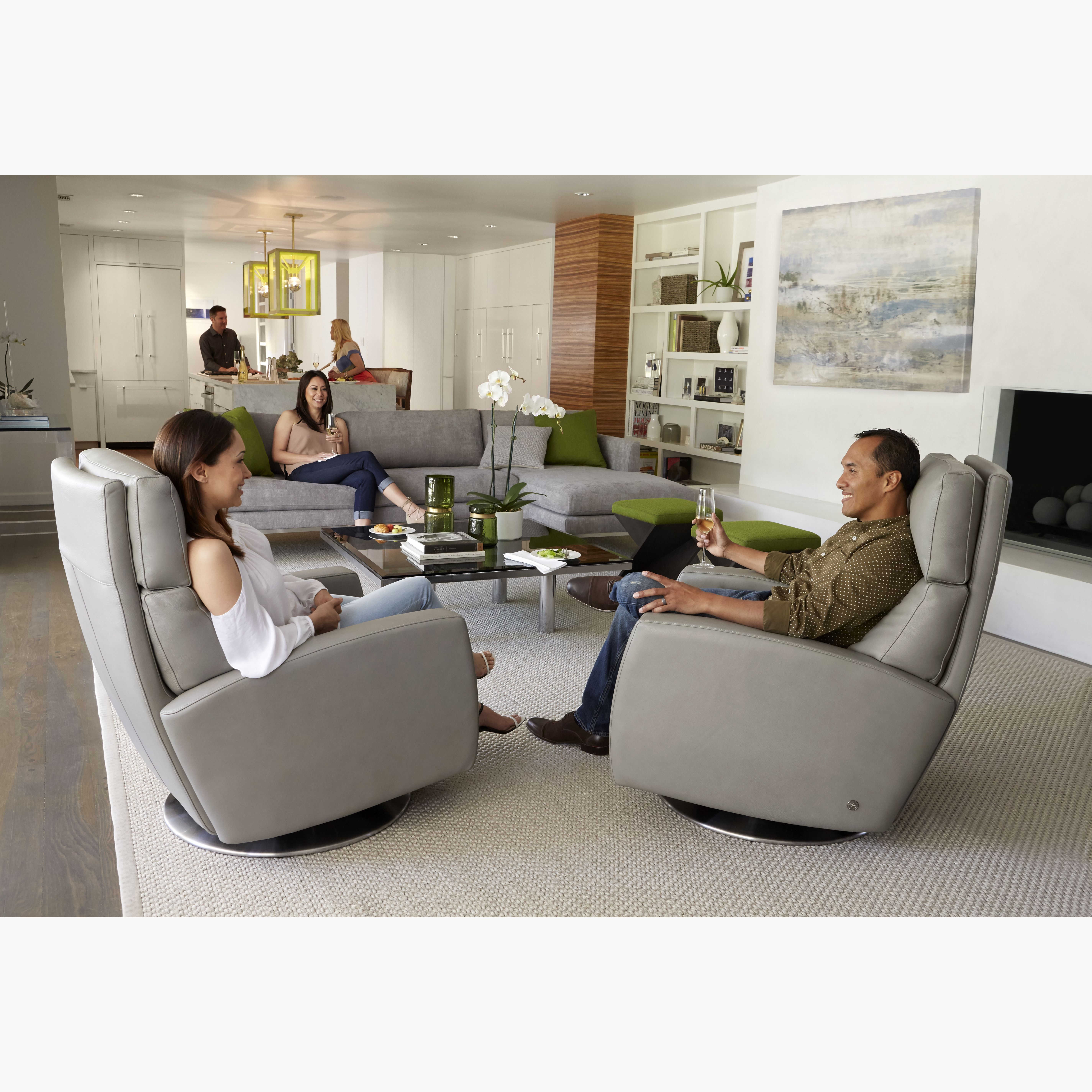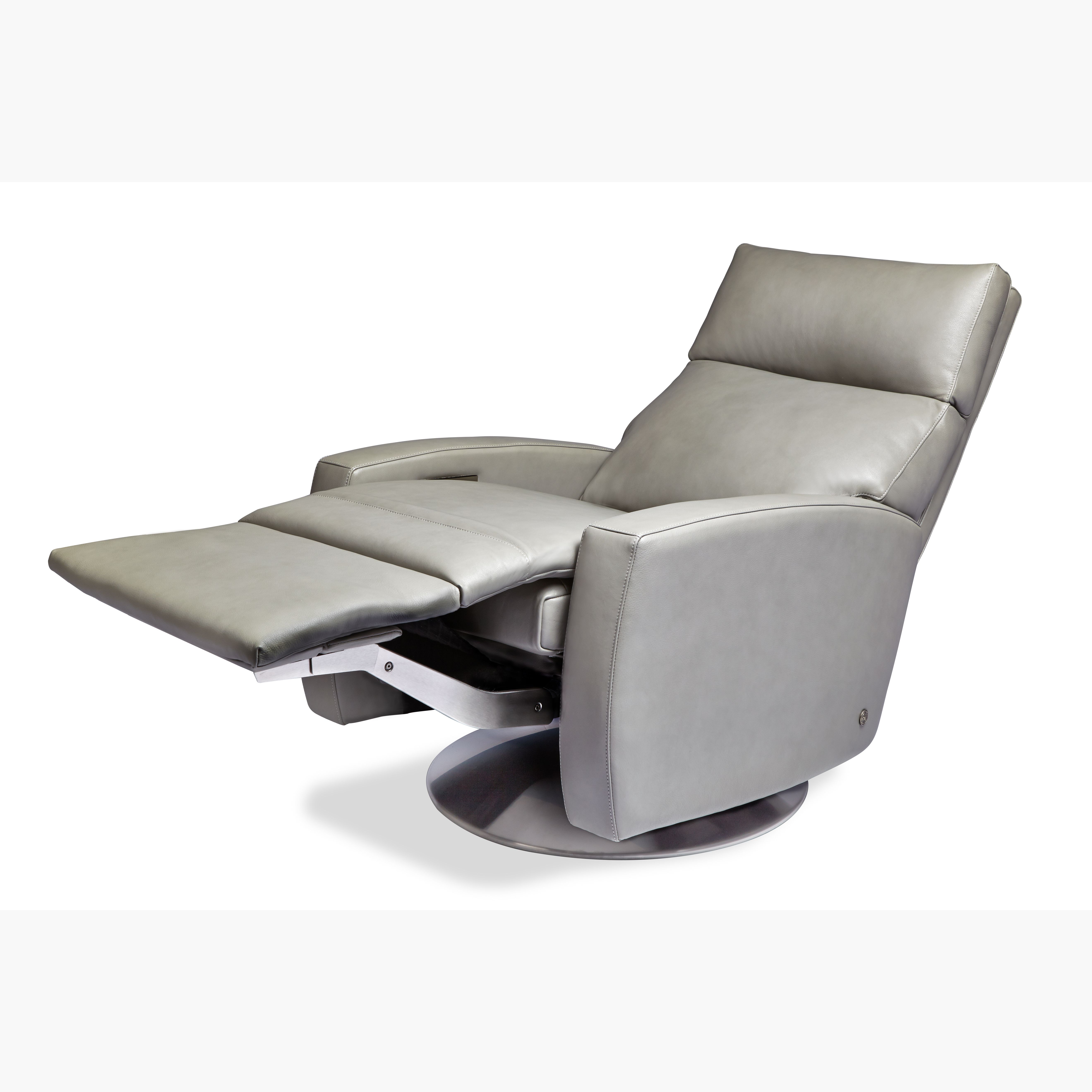 Our Comfort Recliners™ resolve the dilemma of reclining chairs because not only do they sit beautifully but they look great, too. The back and footrest operate independently and are infinitely adjustable so that you can find the sitting position that's perfect for you. With a sleek track arm that overhangs the side panel an inch or two, Demi has an elegant, modern profile. The clean, curvy lines of the arms are accented by our double-needle top stitch tailoring. Specify swivel Stainless Steel, and two wood base options or stationary wood legs in Natural Walnut or Gray Ash.