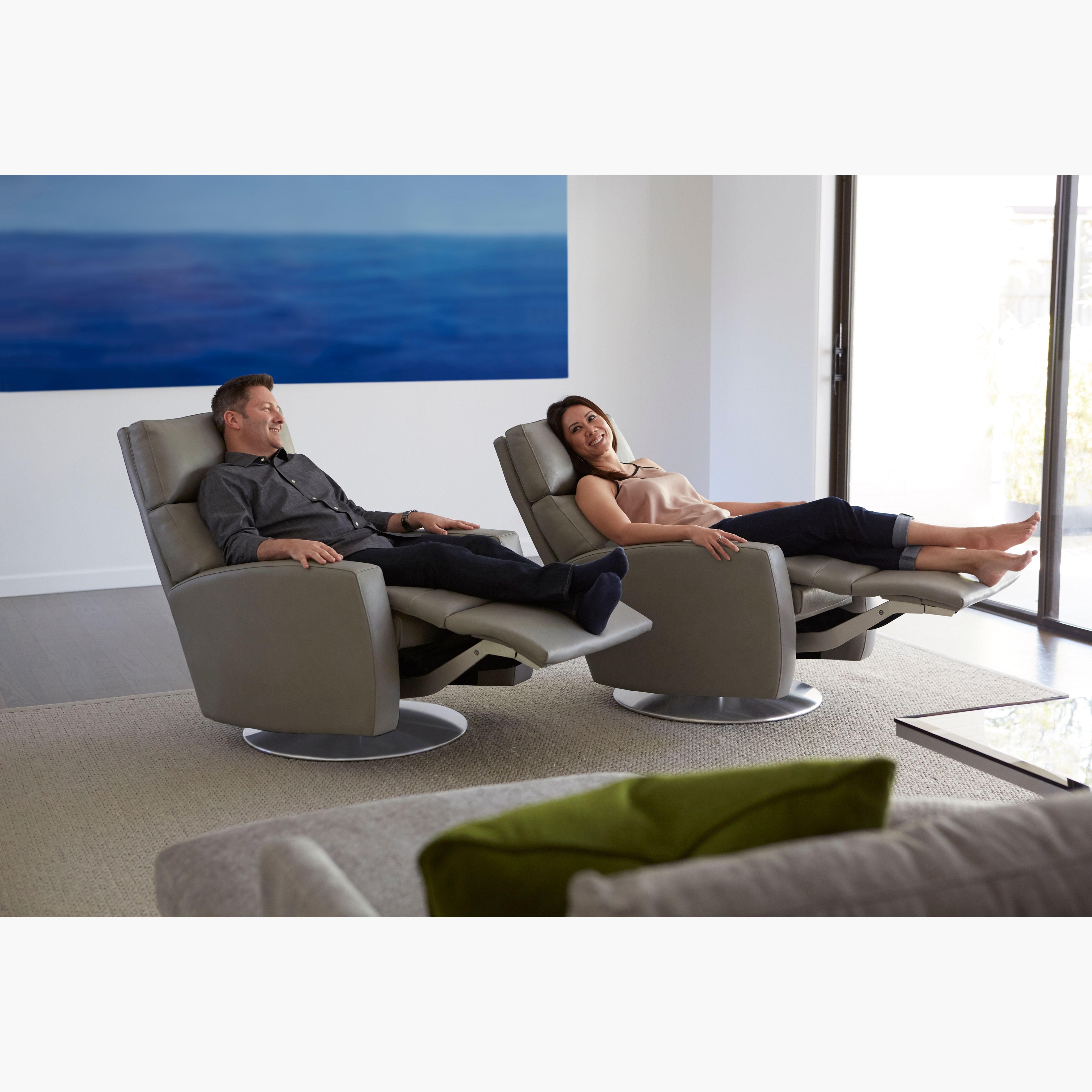 Our Comfort Recliners™ resolve the dilemma of reclining chairs because not only do they sit beautifully but they look great, too. The back and footrest operate independently and are infinitely adjustable so that you can find the sitting position that's perfect for you. The sophisticated Elliot shows off clean lines throughout with the classic track arm as the centerpiece. Specify swivel Stainless Steel, and two wood base options or stationary wood legs in Natural Walnut or Gray Ash.