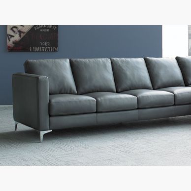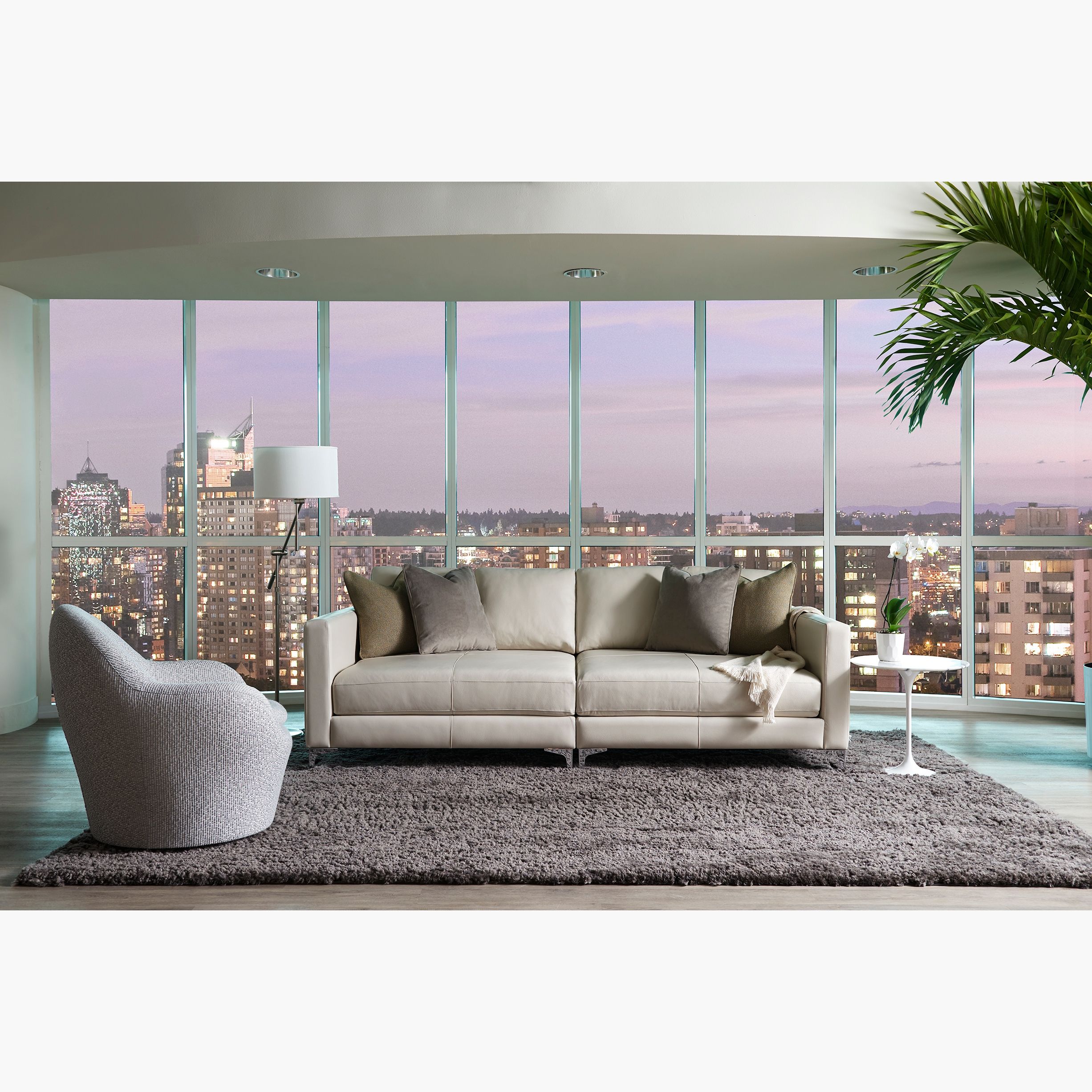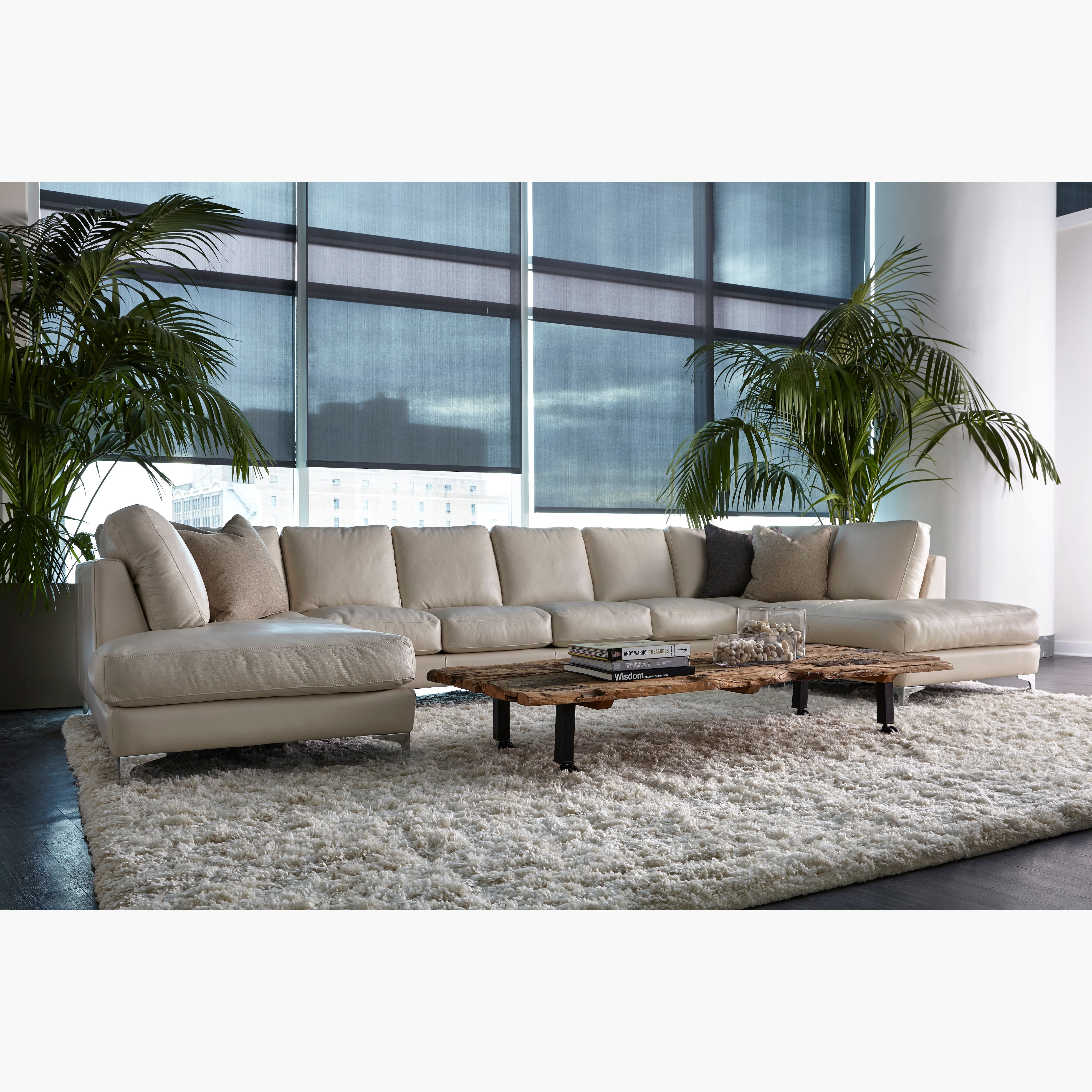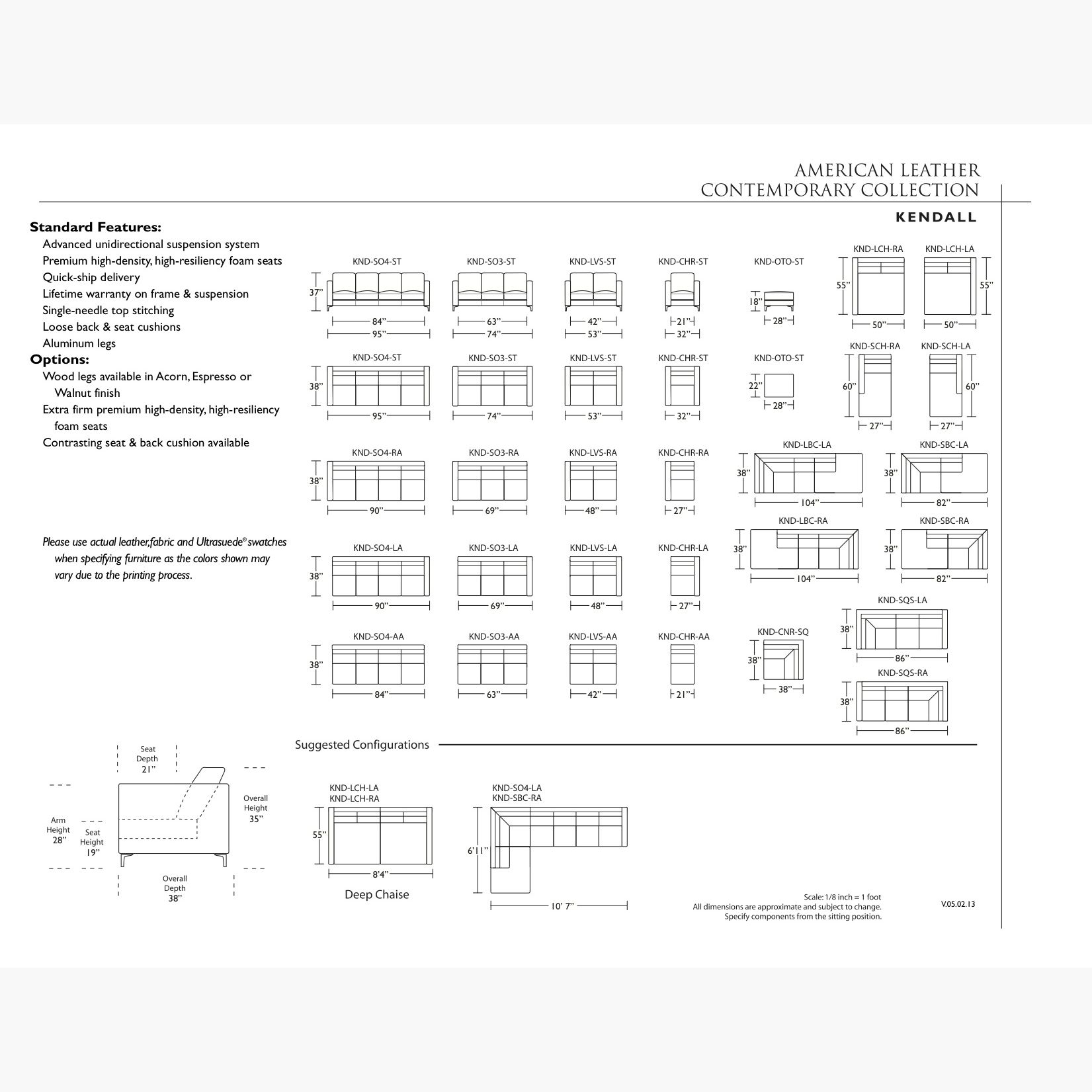 Creativity knows no bounds with the Kendall collection, a grouping with enough potential configurations to solve any decorating dilemma. Options include a four seat sofa, a double deep sofa, an armless version and more. Tailored lines foster still more versatility, along with contemporary design details such as high track arms and angled back cushions that rise above the frame. And for a designer look, contrasting seat and back cushions are available, not only in leather, but in an unexpected mix of leather and fabric.