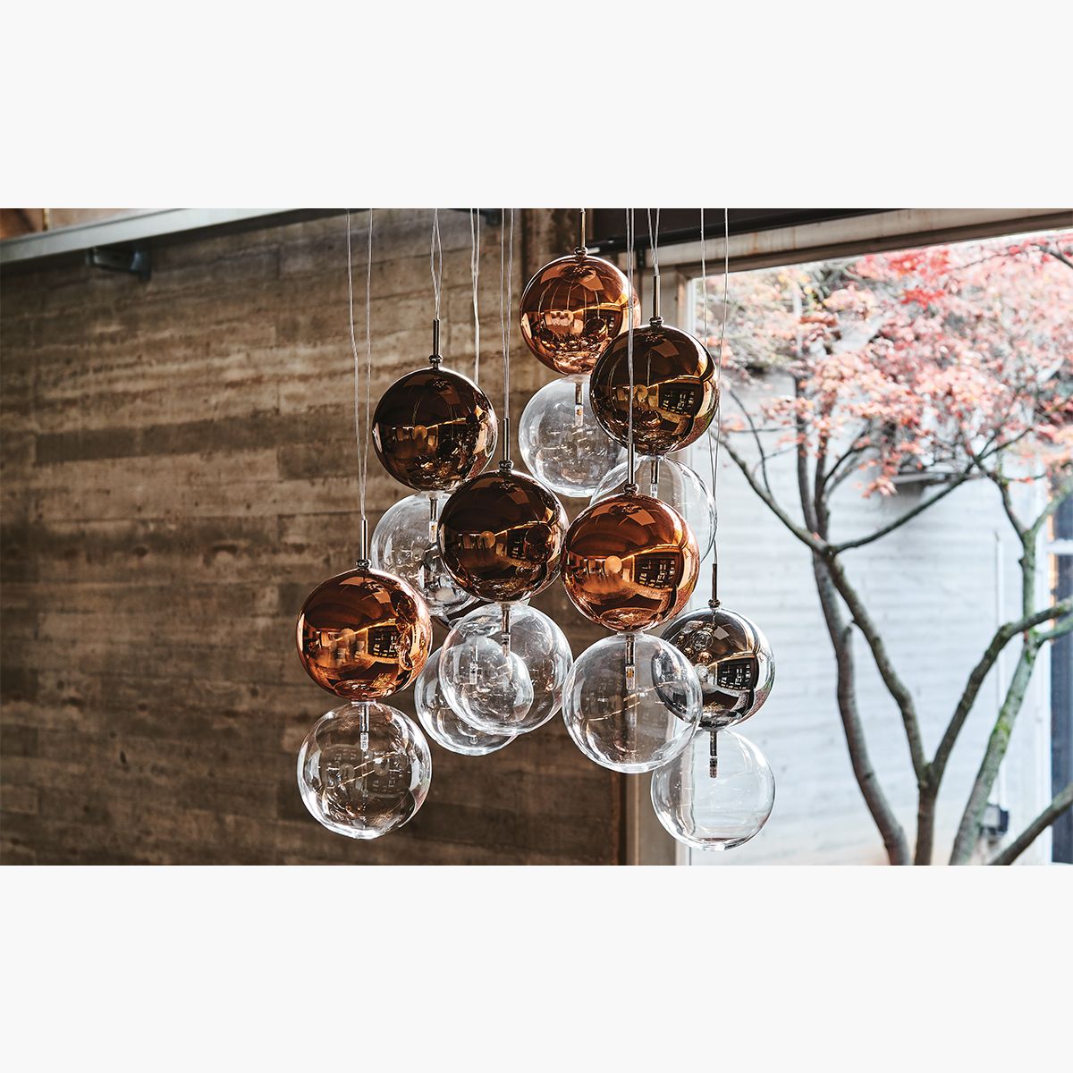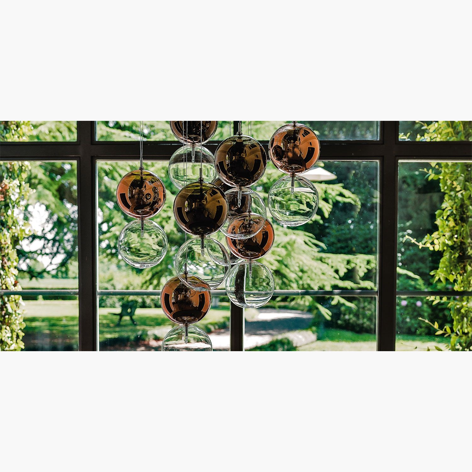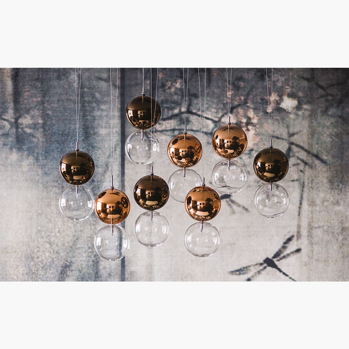 Oriano Favaretto Year: 2015 This dynamic composition of delicate globes suspended in mid-air will transform your living room into a unique place full of personality. The Apollo modern chandelier, conceived by the designer Oriano Favaretto, can have different configurations from 2 to 16 spheres, each of which is able to underline the shapes and volumes of the surrounding furnishings. The colour of the glass lampshades can also be customised in order to emphasise the room's tones. As a matter of fact, each pair of lampshades is composed of a transparent lower sphere and an upper one painted with warm and delicate nuances.This modern ceiling lamp illuminates a contemporary living room with uniqueness and inimitable elegance.