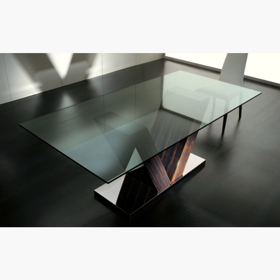 wasser's has this dramatic table in stock in High Gloss Ice & Madagascar Polyester finishes with Stainless Steel platform bas