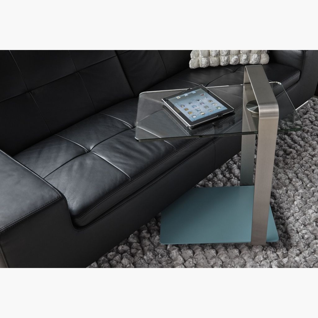 An integral champagne-plated handle supports the ½” thick clear cantilevered glass top, while the unobtrusive twin-wheel casters allow positioning for use with most upholstered furniture.