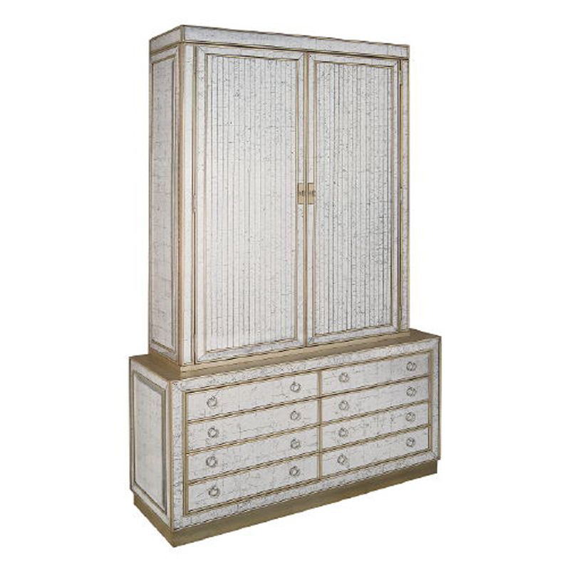 Eglomise Glass Deck: (2) Doors; (2) Adj. Shelves & (1) Stationary Shelf w/ Component Shelves; (2) Stg. Drawers; Slide Out Back; Electrical/Cable Hook-up