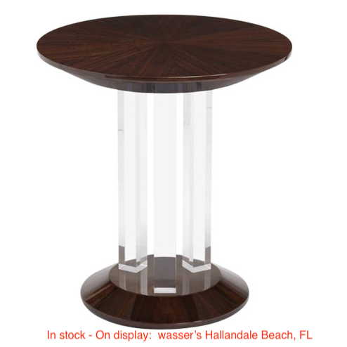Warehouse Stock & Showroom Display: Wassers Exclusive Furniture Manufactured By: Interlude Size: W 23" D 23" H 24" Weight: 58.3 lb. Color: Clear acrylic supports with Figured Eucalyptus woodTop & Base Assembly Required: Comes Assembled Classification: Side Table - End Table - Style: Elegant Contemporary