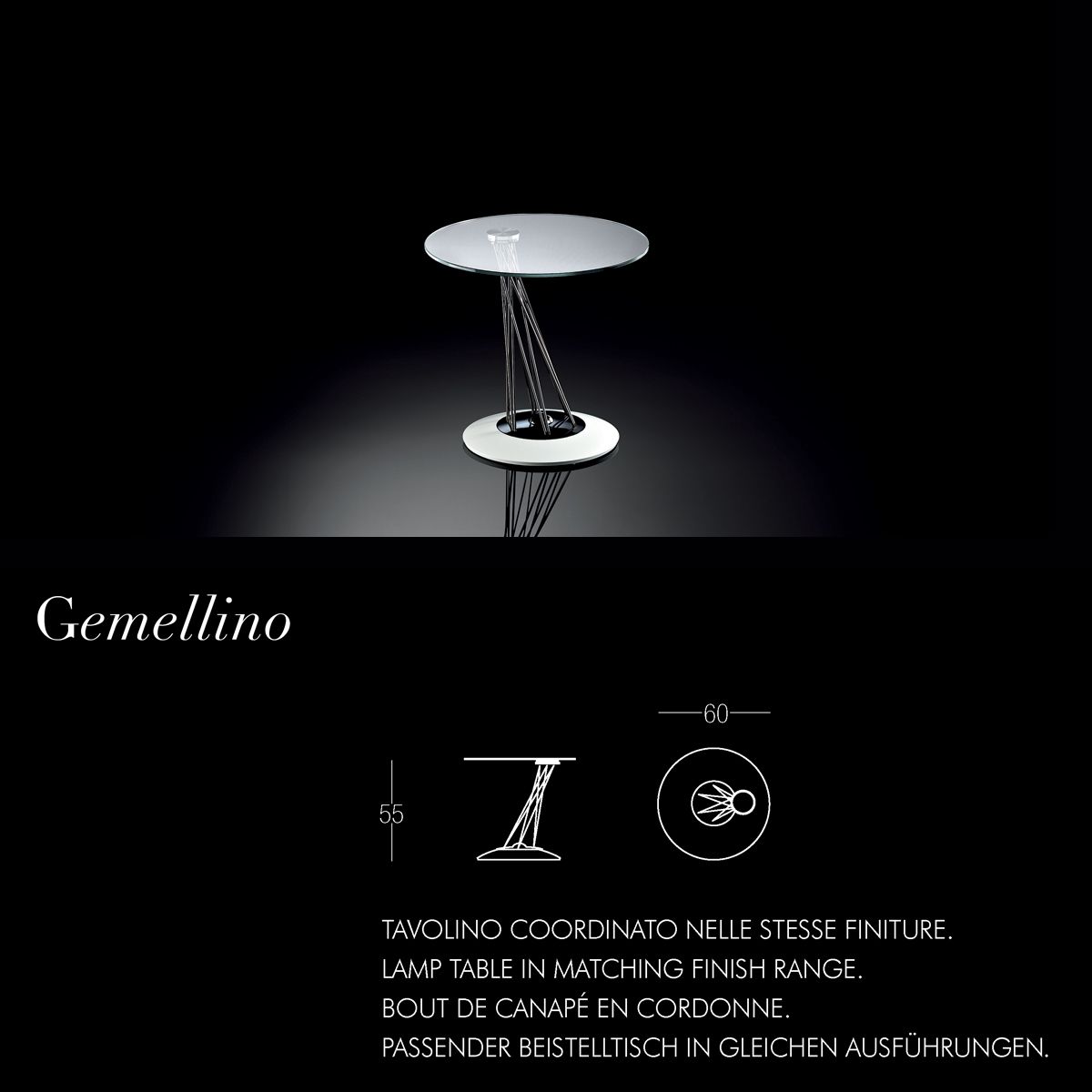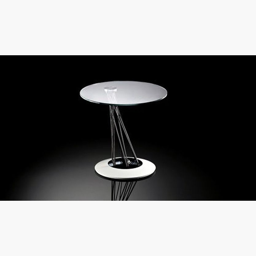 The Gemellino End Table is a lesson in Modern design. Chrome spokes elevate the 3/8'' glass top off center to create an intriguing cantilevered look