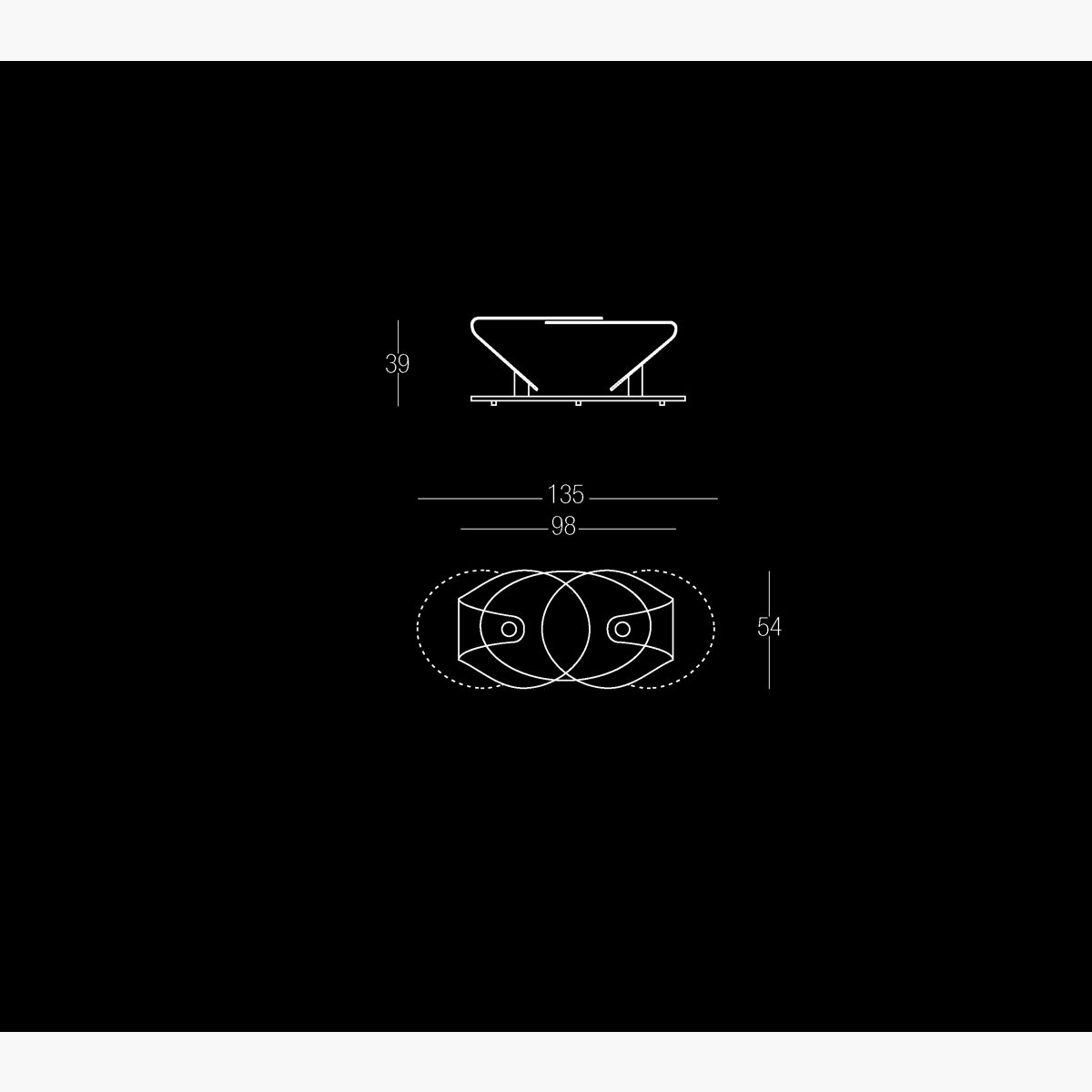 Extendible coffee table with synchronized revolving crystal tops in curved glass. Aluminum supports. The base can be in stratified glass or wood veneer and it is equipped with a mechanism for the synchronized rotation of the tops that allows ample modulation of the form.