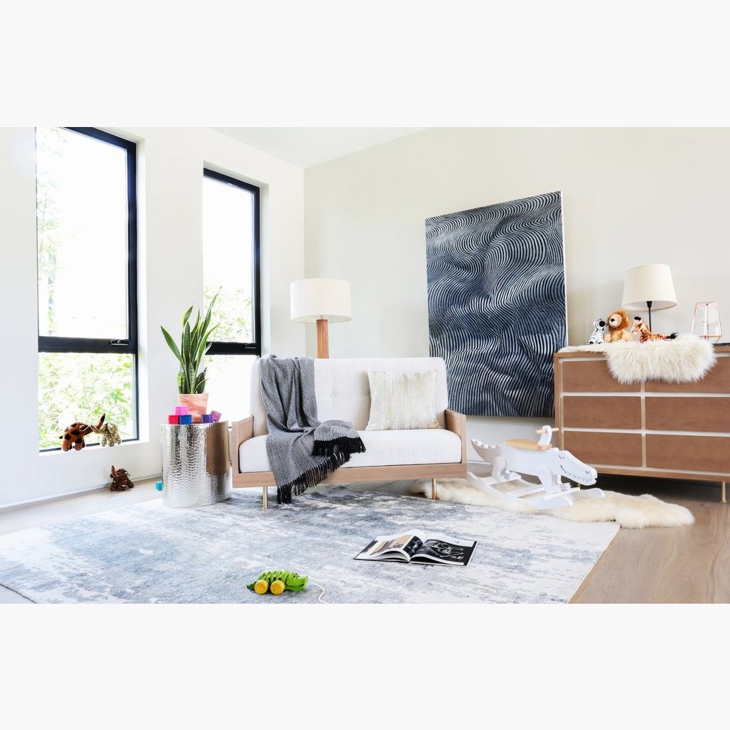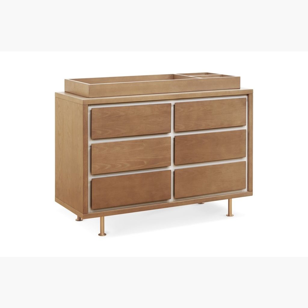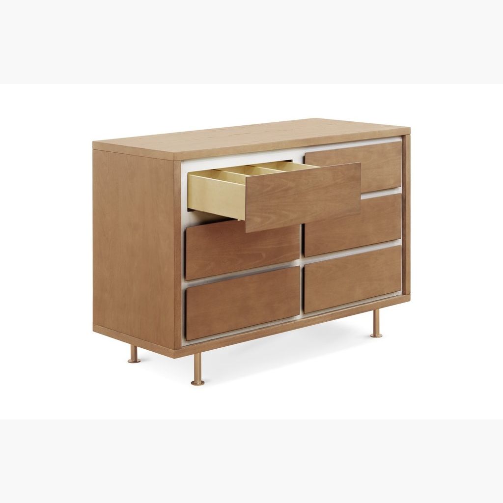 The Novella 6-Drawer Double Dresser is highlighted by the contrasting, inset, ivory-painted panels. Each dresser is given a satin finish with "water-based" stain that highlights the natural Ash grain. The six spacious drawers offer ample storage for baby essentials, clothing and bulky items, while the removable dividers allow parents to create compartments suited for stacking diapers or holding little items such as socks that tend to get lost in big drawers.