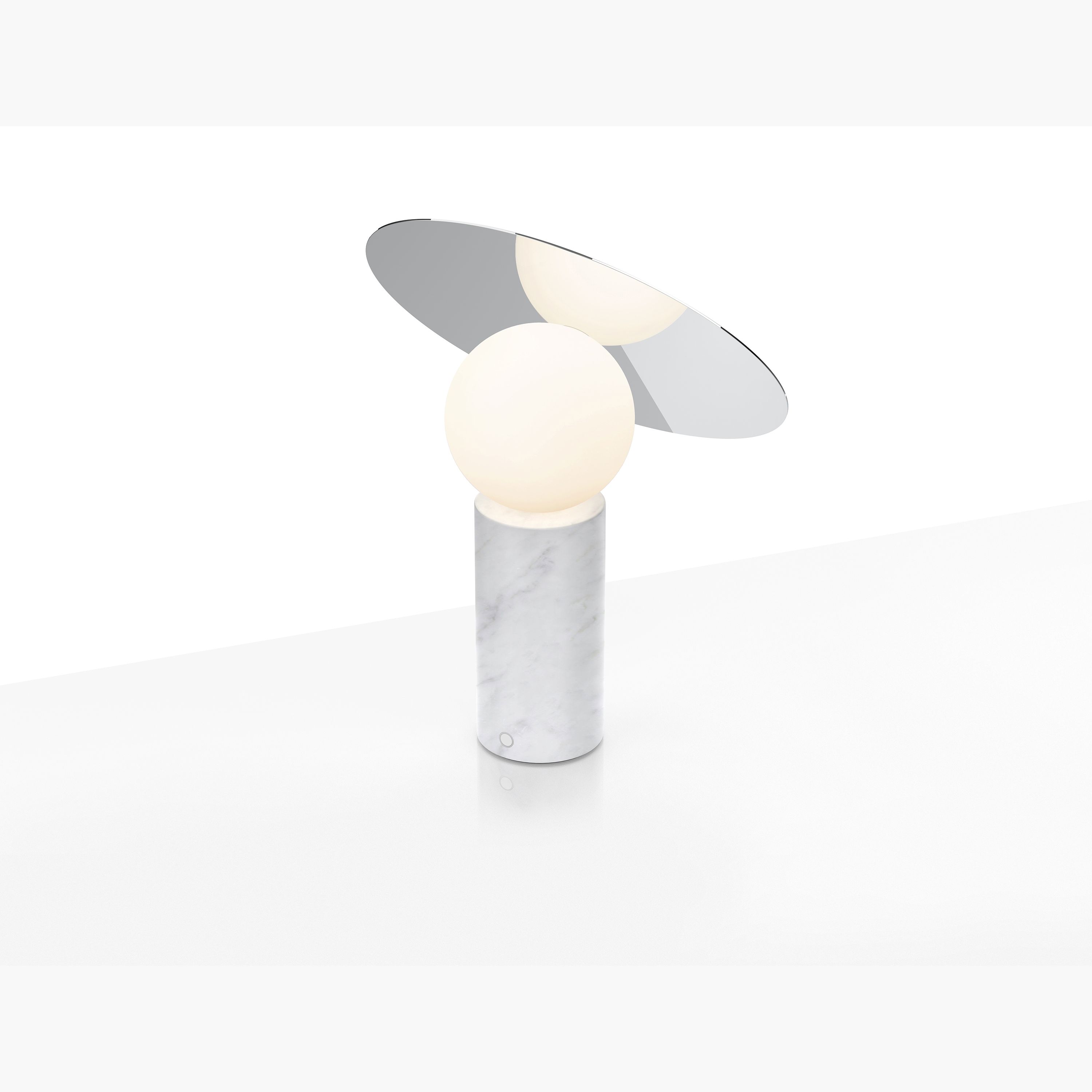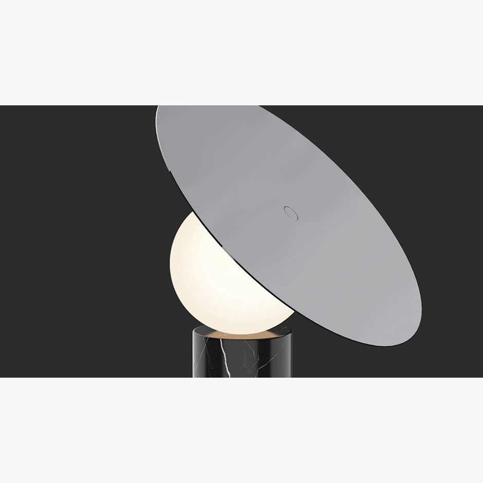 Bola Disc Table's iconic silhouette is defined by its elegant chromed stainless steel disc shade positioned at 45 degrees while elevated by an opaline glass globe diffusor that appears to float over its marble cylinder base. The shade can be rotated 360 degrees to provide multiple lighting possibilities allowing its friendly asymmetric design to cast both direct and indirect light where you need it most.