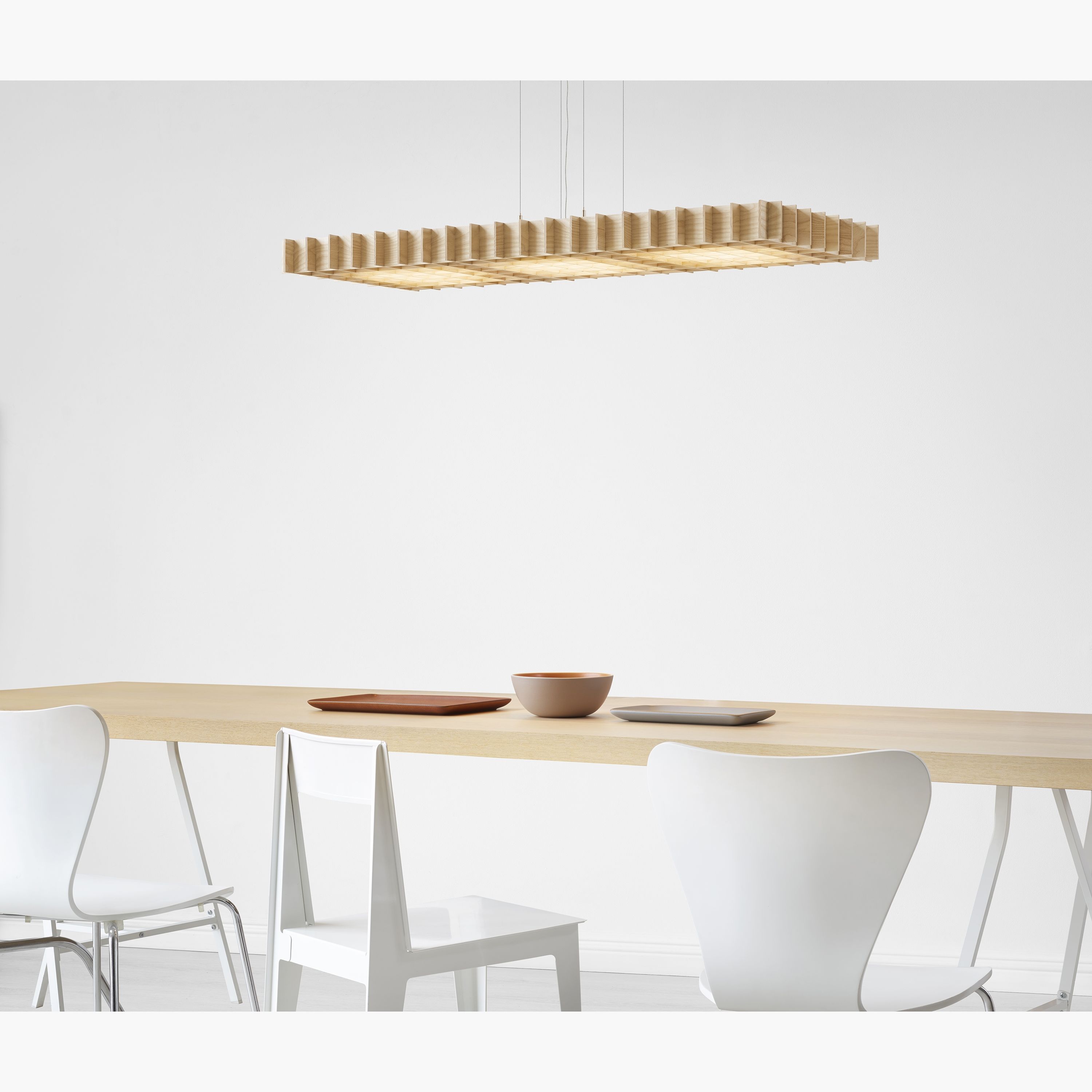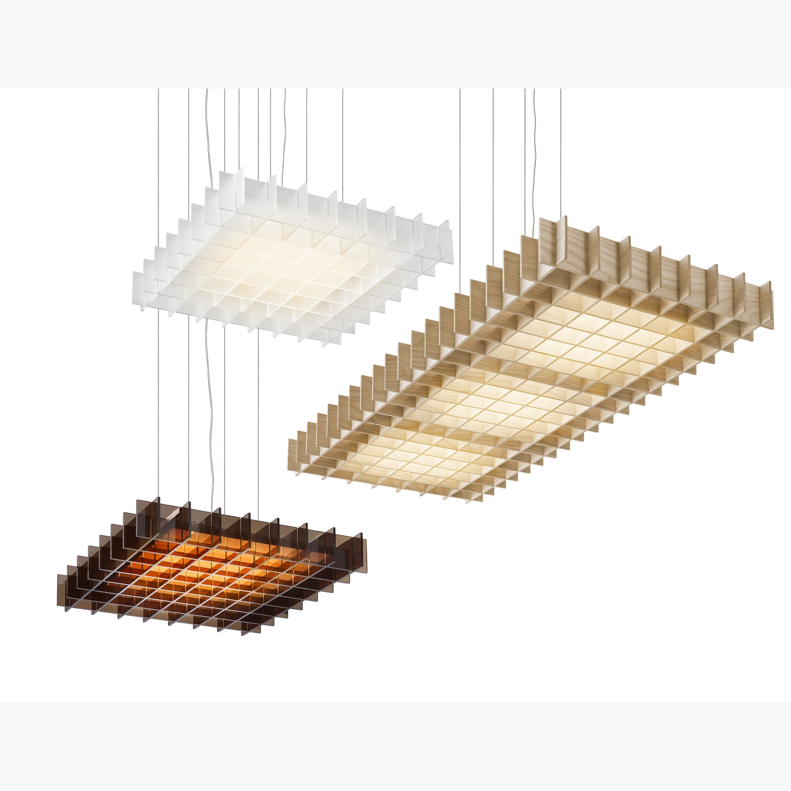 Inspired by Japanese joinery tradition, Grid conveys a lightness and weightlessness of form in its orderly structured frame of natural wood or optically clear acrylic. The CNC cut slats provide both optimal diffusion from side viewing angles while celebrating a rich palate of natural woods and rich colorways to direct warm ambient light downward with minimal light spill. Grid can be suspended individually or in series to create