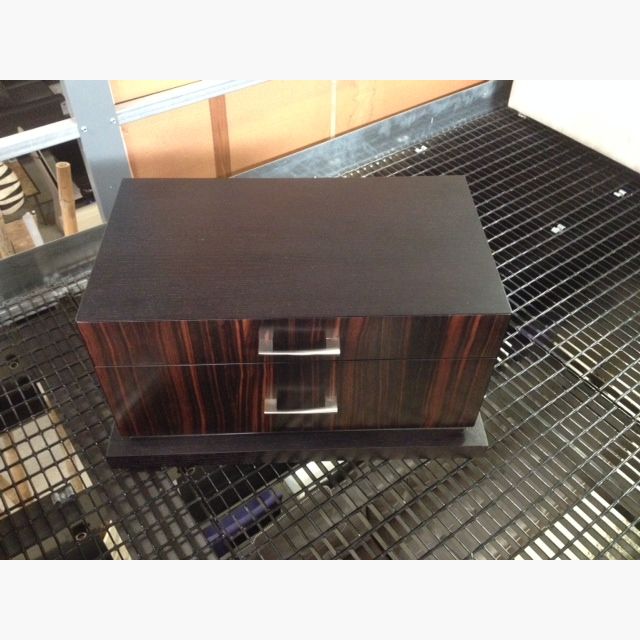 High Gloss Mozambique Veneers in combination with Serused Oak & Stainless Steel hardware .