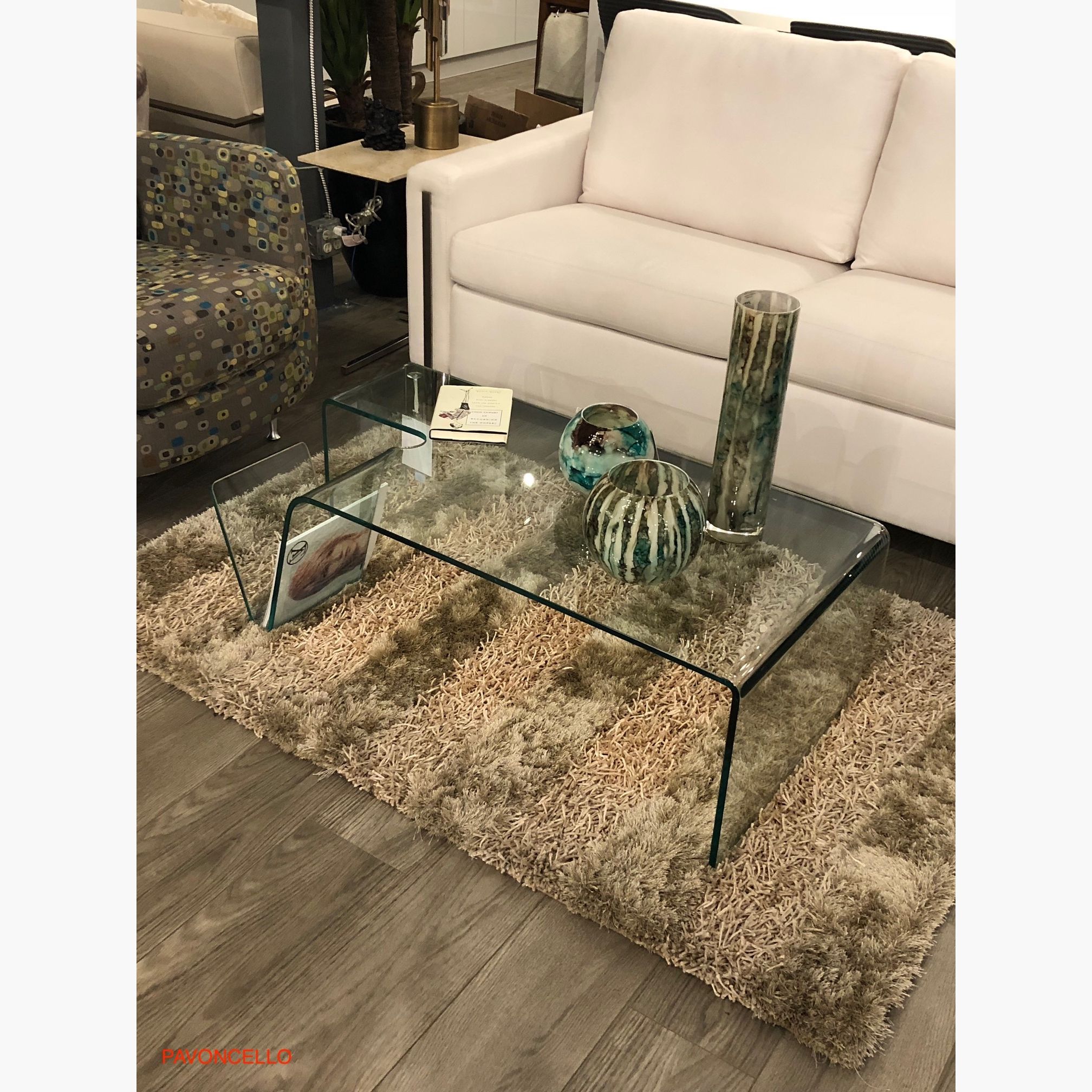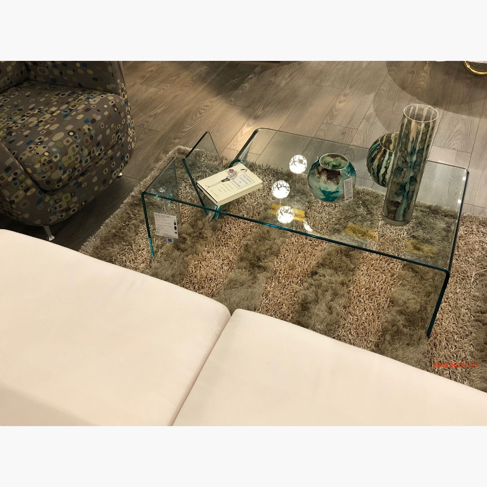 A stunning award-winning design from the Pavoncello "whereisit" collection illustrates the flowing shape made from 1 piece of glass. Inspired to present the best of style, form & and function.